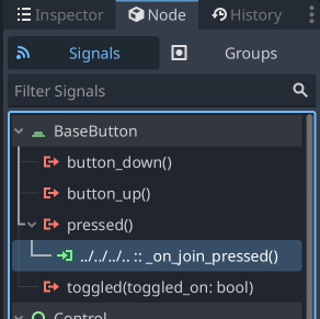 The Node tab shows the places a signal is received! So presumably you can have the Game script do the Join logic, but could also attach the pressed Signal to other UI elements to animate them, etc. Signals are cool for calling code anytime a certain thing happens, and this is a really neat-feeling way to set up and manage these.