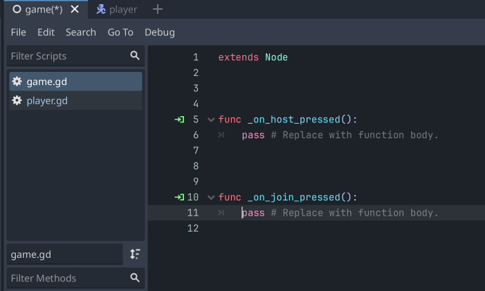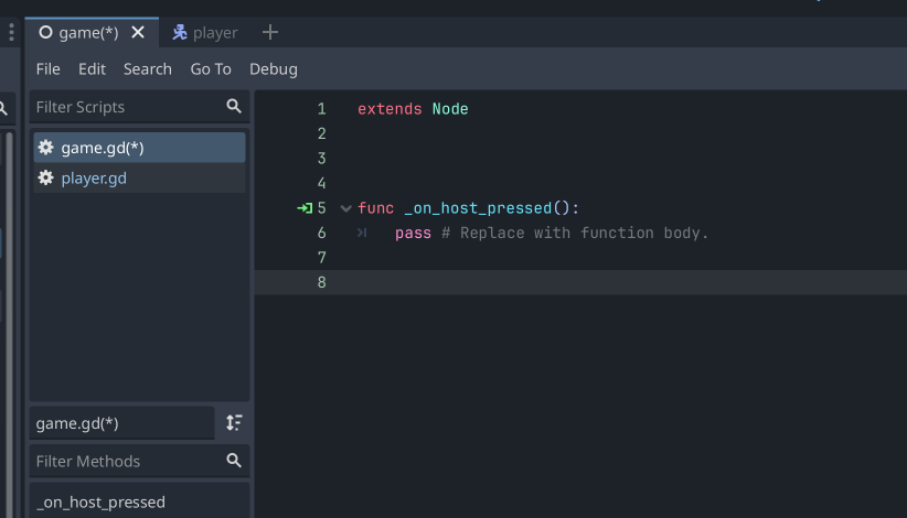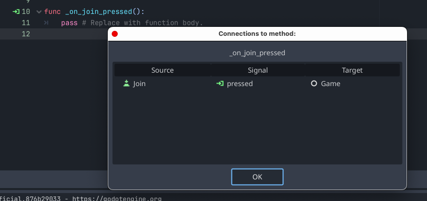 That's it! The function is inserted into your script. So now anything you add to the _on_join_pressed() function will happen when the Join button is pressed!