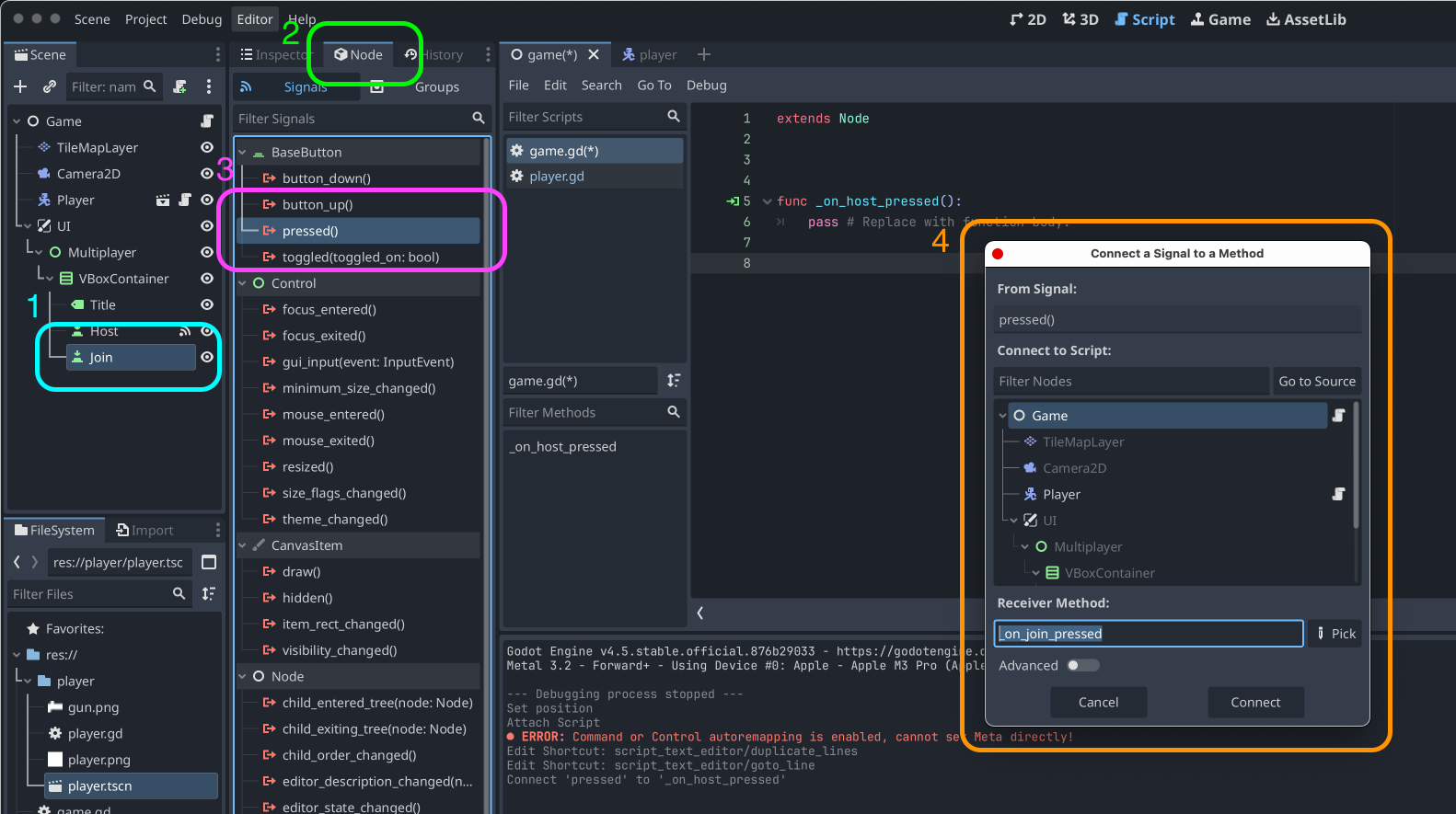 This opens a modal, "Connect a Signal to a Method." If you already had the Game Script selected, all the defaults are good. But you can select the Node Script you want to attach the Signal to. You can also customize the name, but it builds a good default! _on seems to be a Signal default, _join is whatever the Node is named, and _pressed is the name of the Signal event!